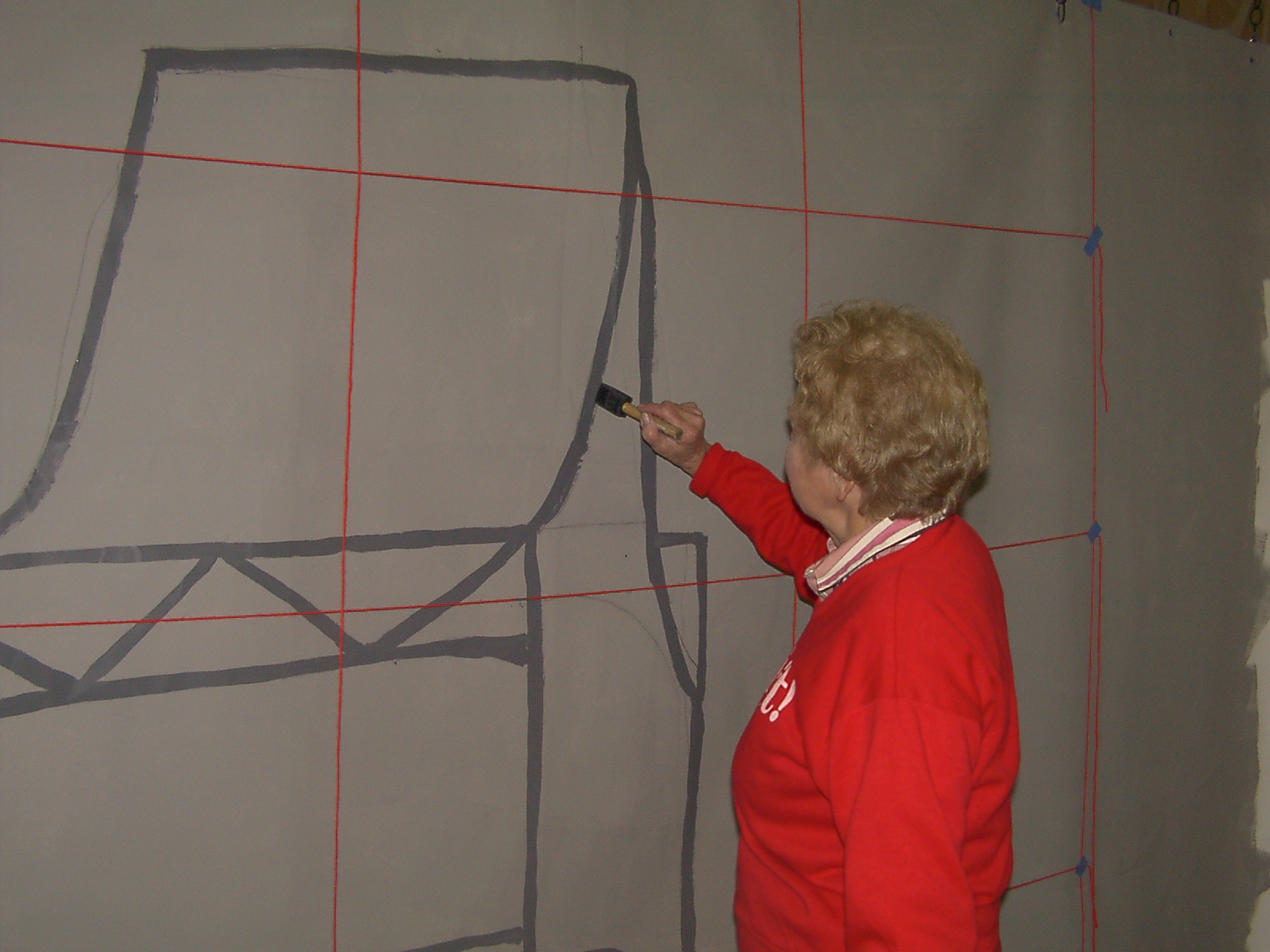 Joyce is a talented artist, with many years of folk art painting to her credit. She also paints our Lagniappe Fete stage backdrops. In 2006 Lagniappe member, Sandra Sanford, had a vision of a backdrop with the perspective of crossing the Mississippi River bridge. She gave Joyce a photo and Joyce translated it into a fluid painting complete with Christmas tree lights atop the bridge. It gave one the feeling that they were really crossing a bridge. Here is Joyce painting the first backdrop in 2006.