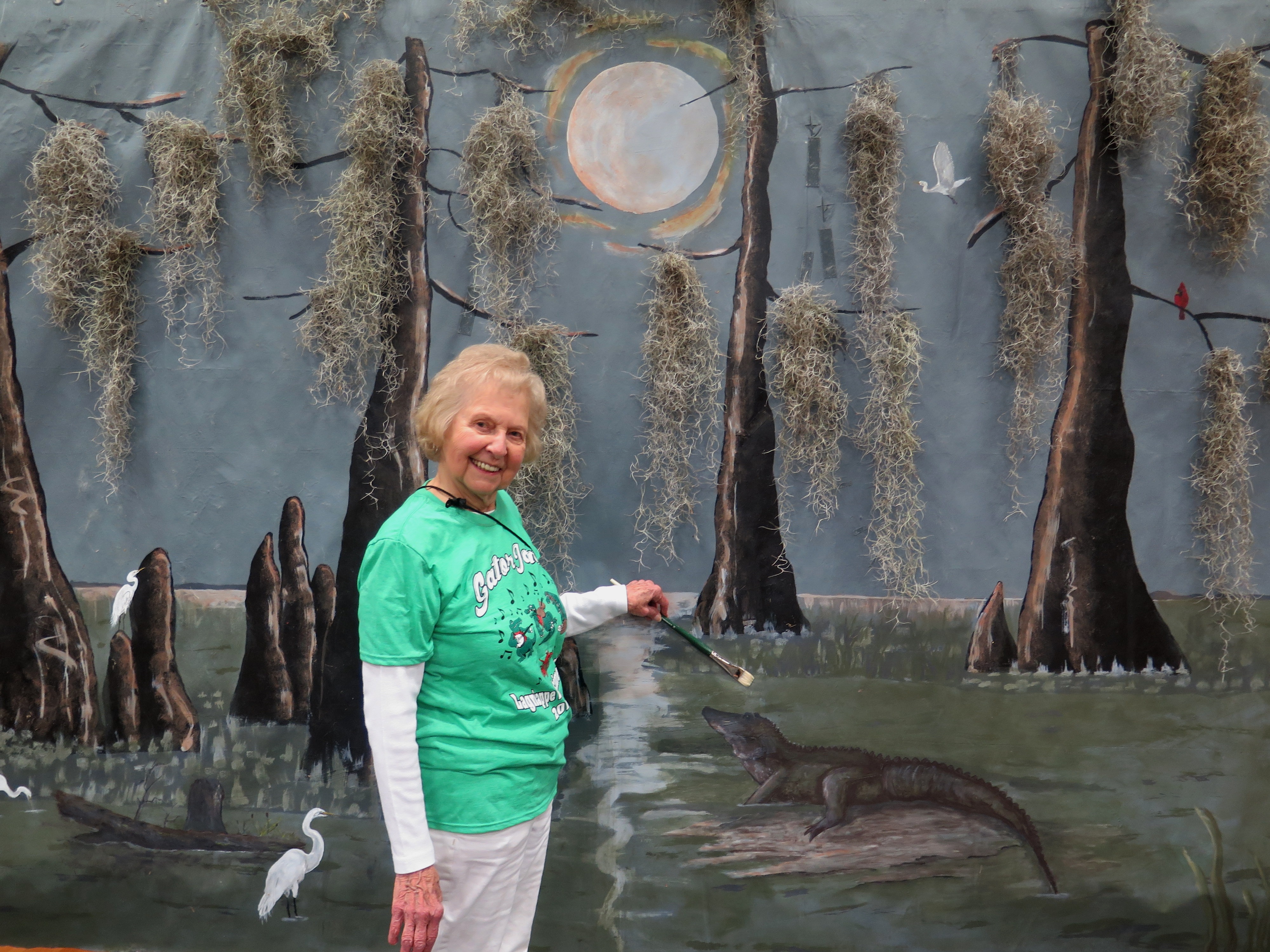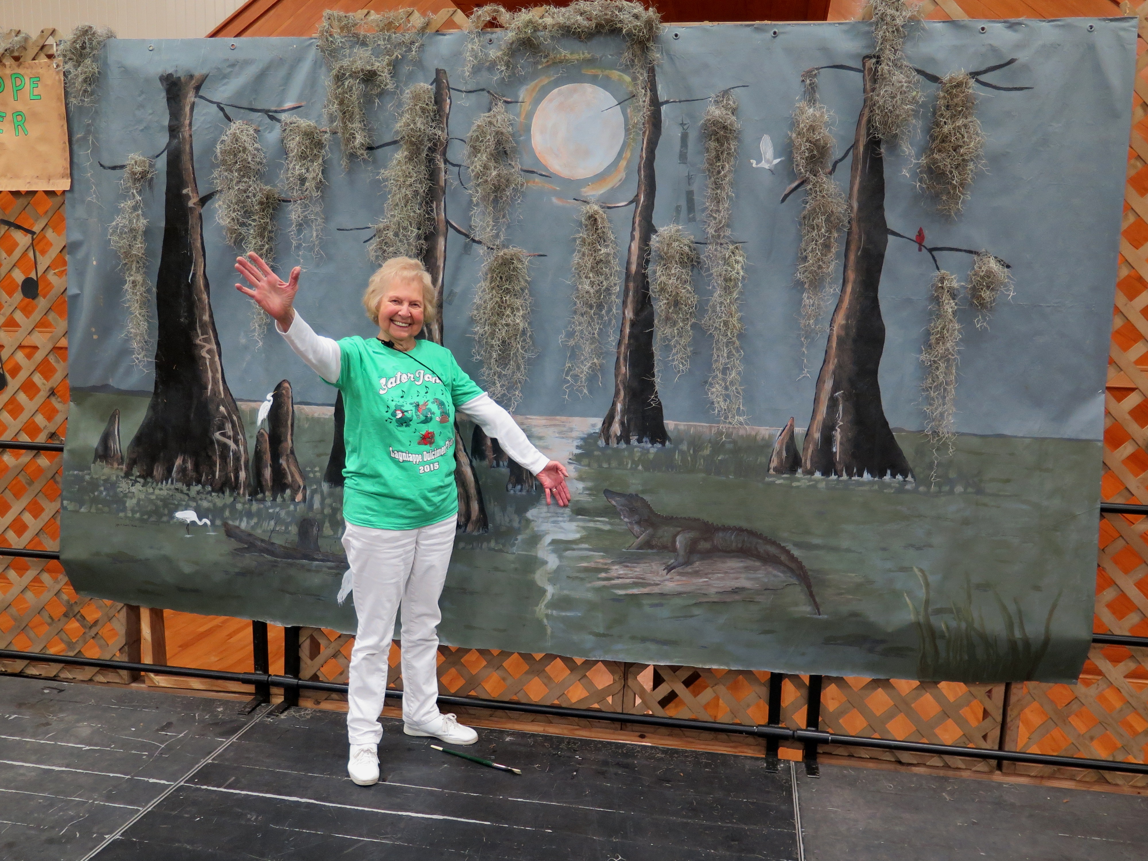 Over the years, Joyce has repainted the backdrop several times. Now the swamp scene stays and the small details, such as the alligator and tiny red Cardinal, are added each year. Her backdrops give the festival a touch of Cajun Louisiana and our swamps.