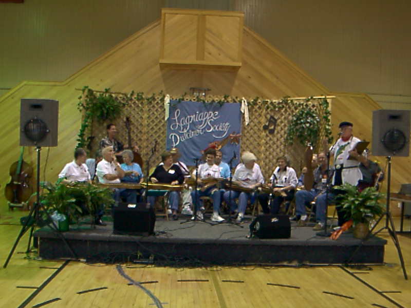 The museum is located in the old parish courthouse. The old building has thick walls and pillars. Here are some dulcimer players jamming in 2004 on the front steps of the museum. The museum underwent an expansion after this, increasing in size and number of meeting rooms. We meet in a variety of rooms and, in good weather, on the front steps.