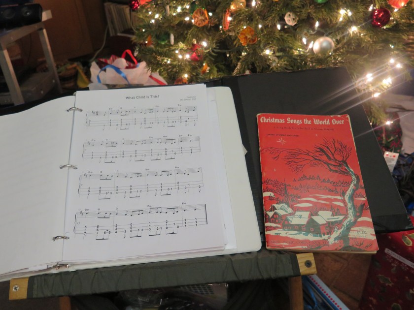 What a problem — holding 3 sheets of music at the same time. It’s a balancing act so that the dulcimer player can see the music all at the same time without flipping pages.