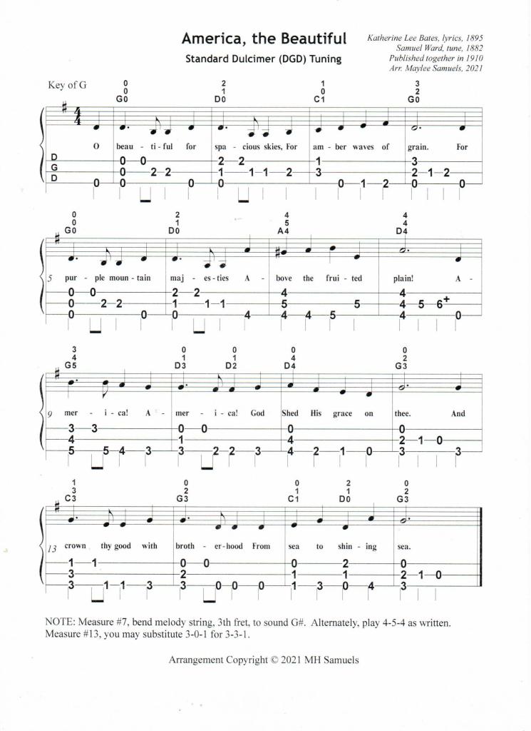 Recently I took an auto trip down the East coast from Boston to Louisiana. The landscape was lush and it really was a beautiful drive through all the mountains and farmlands. I didn’t even mind driving along the interstates as tall, mature trees lined the highways making for a scenic drive. I thought of the patriotic song, “America the Beautiful, ” as we drove along. This is one of those tunes which makes us proud of our country through the visual images of the landscape. I arranged the tune for a mountain dulcimer in time to learn it for the Fourth of July. I used the DGD tuning since it is much easier to sing this song in the Key of G than the Key of D.