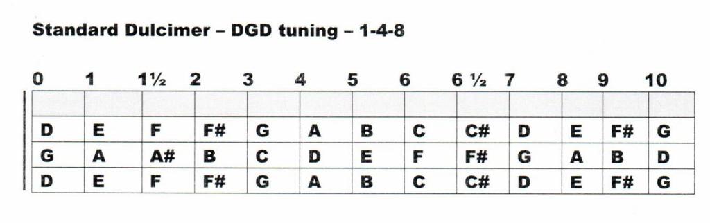 To tune your dulcimer to DGD tuning, simply lower the middle string one note from “A” to “G.” It is easy to do this using a tuner. And remember that changing a string by only one pitch means that you only have to turn the turner about half a crank. Don’t over-do the tuning. It is so simple and easy to do! (Just make sure you are changing the middle string and have figured out which way to turn the tuner to lower the pitch — not raise the pitch.)