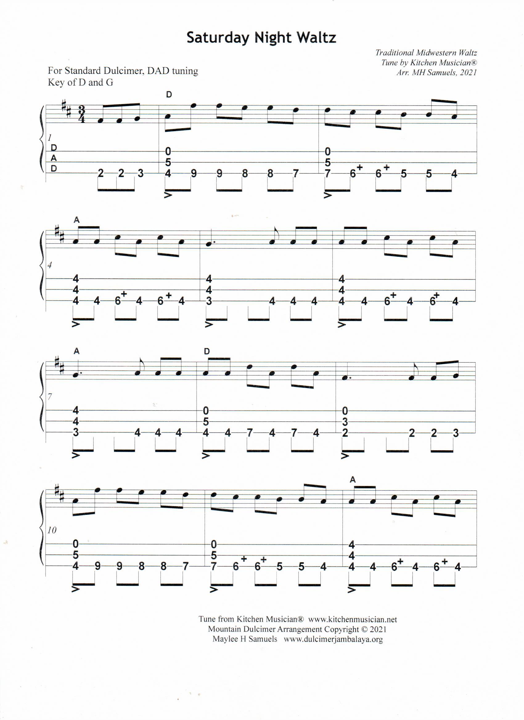 Here’s a slow and dreamy waltz for a Saturday Night dance. The song is quite repetitious and monotone, with some subtle harmony notes; it is sort of mesmerizing. The tune changes keys in the middle of the song to an almost completely different melody; waking you up. I can see the waltz being played at a hot and steamy Saturday night jam and dance. The song comes from the Kitchen Musicians®, a folk group headed by Sara Johnson, who collected it from Michigan fiddlers. Years ago at a workshop during the week-long “Dulcimer Players Workshop” at Appalachian State College, we were given a tune to arrange for the mountain dulcimer. “Saturday Night Waltz” was quite a challenge because it was played in the Key of G changing in the middle of the song to the Key of C — not easy for a rookie dulcimer player. I set the tune aside for years but never forgot about it. With more experience, I recently got the tune out again decided to give another try at arranging it. I really like my results and managed to arrange it for a dulcimer tuned to DAD in both the Keys of G and C and also the Keys D and G.