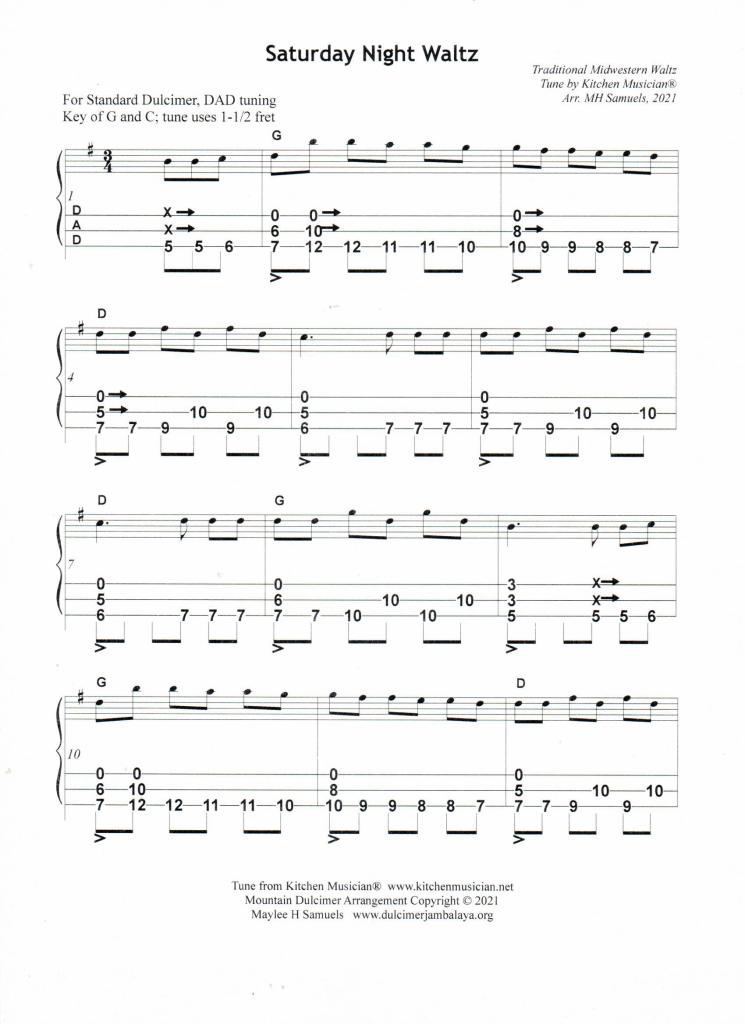 With a little experimentation, “Saturday Night Waltz” turned out to be easier to arrange and to play on the mountain dulcimer than I had expected. The tune does change keys in the middle of the song, making for a bit of a challenge for a dulcimer player. I tuned my dulcimer to DAD tuning. You do need a 1-1/2 fret to play the B Part (second half of the tune) in the Key of C. This arrangement has many notes at higher frets; you need a dulcimer with a nice resonance at these high frets.