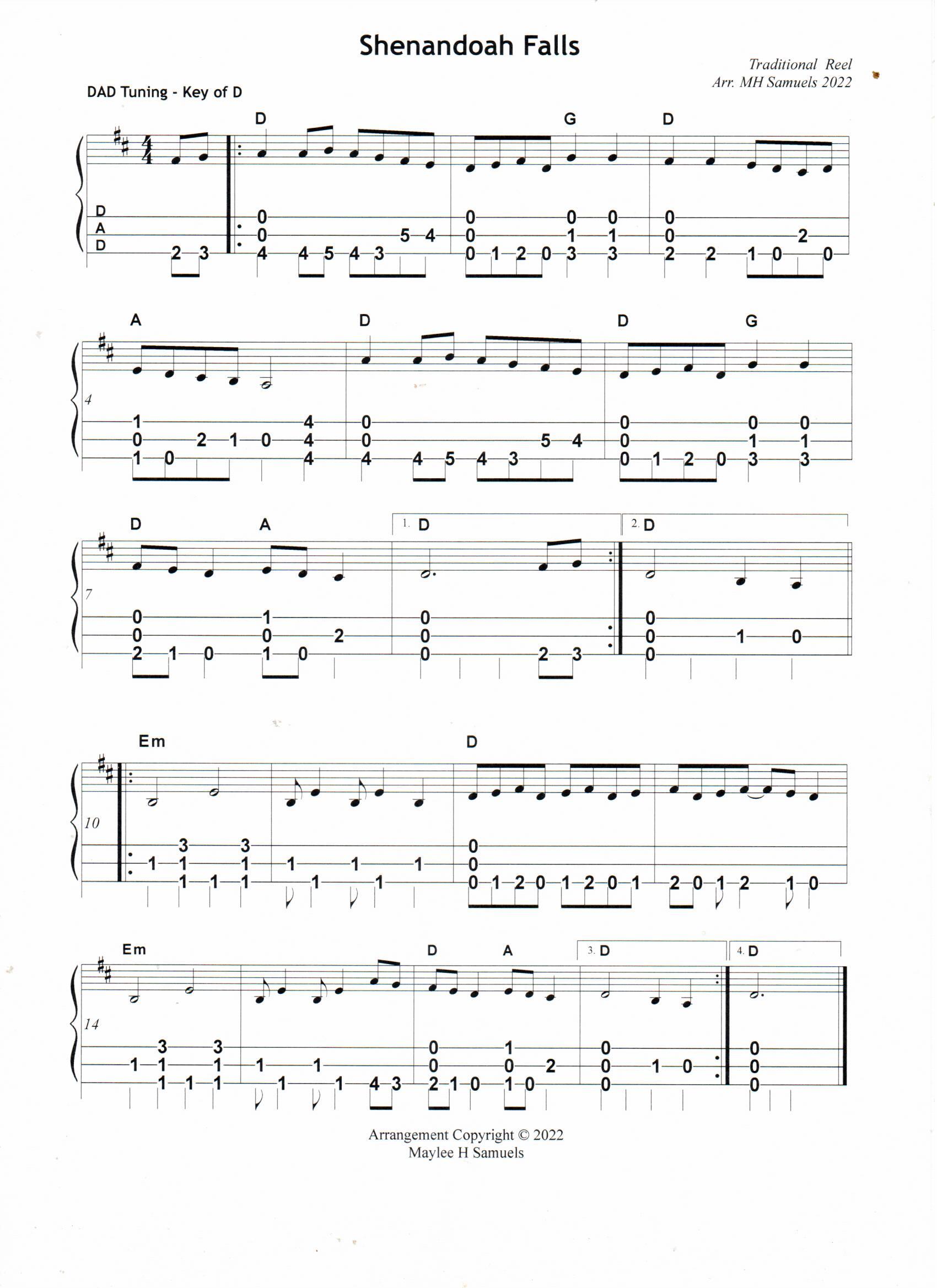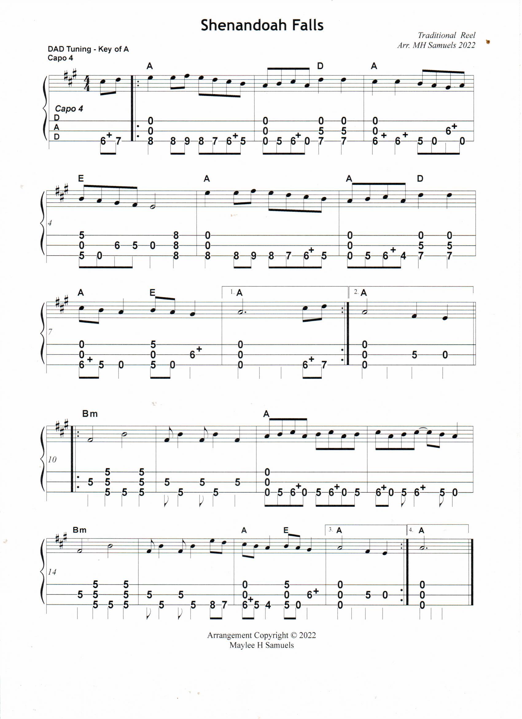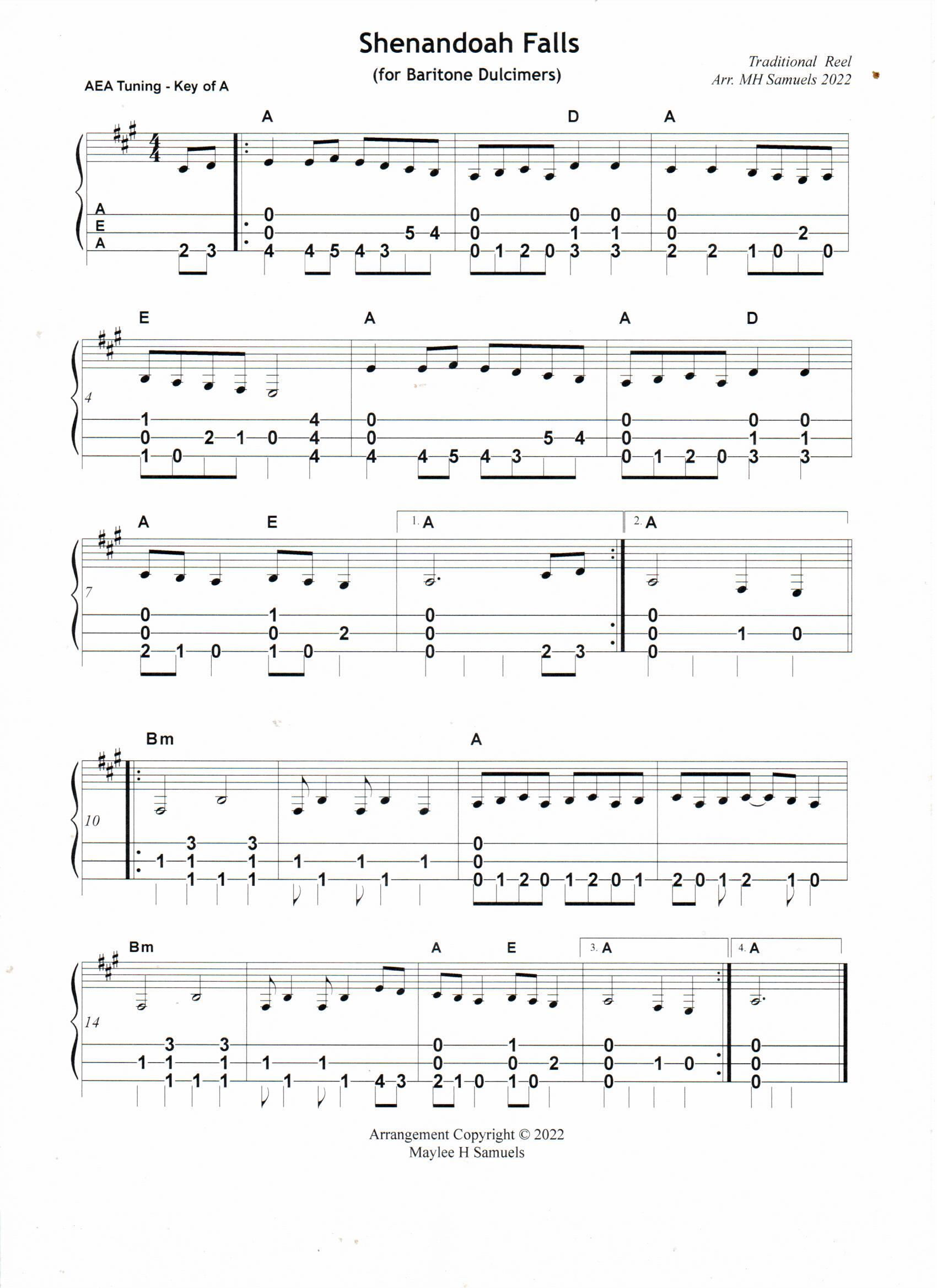 “Shenandoah Falls” is a peppy little reel which I first heard played on the hammered dulcimer. The melody makes you “perk up” and tap your foot along with the musicians who are playing the tune. The title makes me think immediately of the Shenandoah River. However, while researching the origins of the tune, it appears to have nothing to do with the Shenandoah River or the Shenandoah Valley. An Irish internet site, “The Session,” calls it “Shannandoah Falls.” Nevertheless, I felt a connection with the tune having grown up in the Shenandoah Valley. And so I arranged it for mountain dulcimer. It is one of those “mesmerizing tunes” which you can play for hours — lots of fun.