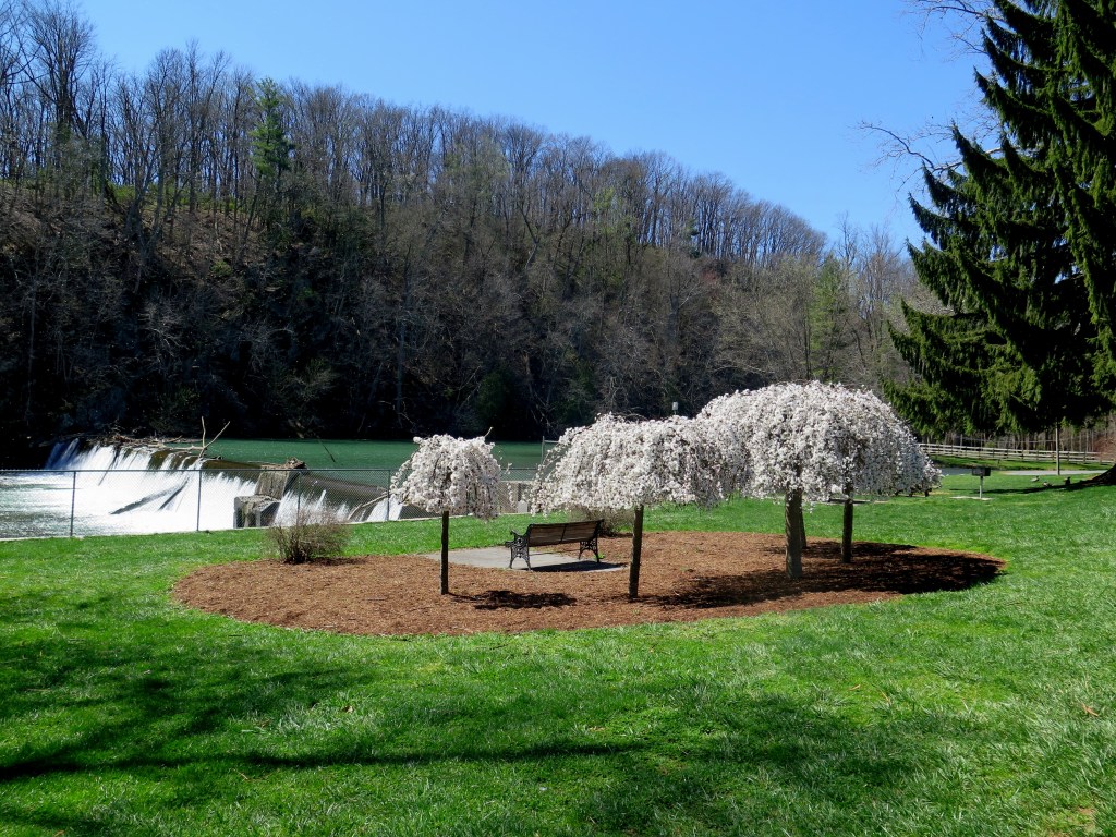Incidentally, having grown up in the area, I do not know of any waterfalls on the Shenandoah River. This river meanders through the flatlands of the Shenandoah Valley with not much change in elevation. The river does descend with rapids around Harper’s Ferry, Virginia, picking up speed as it merges into the Potomac River. But alas, no waterfalls. Even the three tributaries which feed into the Shenandoah River do not contain waterfalls — these are South River, Middle River and North River. Here is a damned section of North River at Bridgewater, Virginia, as this branch descends from the mountains and flows into the Shenandoah River.