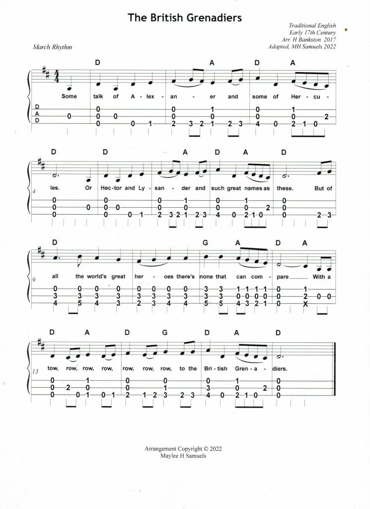 Here is our tab for the tune, “The British Grenadiers.” The tab is in DAD and is straightforward. Since this is a march tune, it is important to keep the rhythm steady. I have included the lyrics for “Free America” at the end of this blog post.