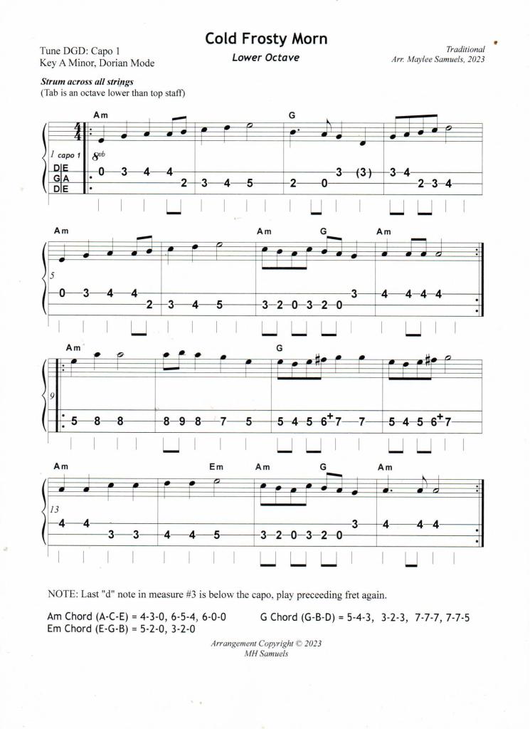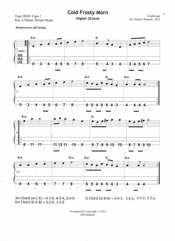 “Cold Frosty Morn” is another haunting Irish, modal tune which is played in the Key of A Dorian, a minor key. Last month, I re-tuned my mountain dulcimer to DGD, capo 1 so that I could play the tune, “The Congress Reel” in A Dorian. Why not find another tune to play while the dulcimer is re-tuned to this modal configuration. With a little effort, I figured out a pleasing arrangment for “Cold Frosty Morn” in both a lower and higher octave. Often this tune is played by placing a capo on the 4th fret of the mountain dulcimer to play in A minor. The disadvantage is that the wonderful, deep string tones of the lower frets of the dulcimer are lost. Sometimes the dulcimer seem to whine. DGD, capo 1 tuning eliminates this problem.