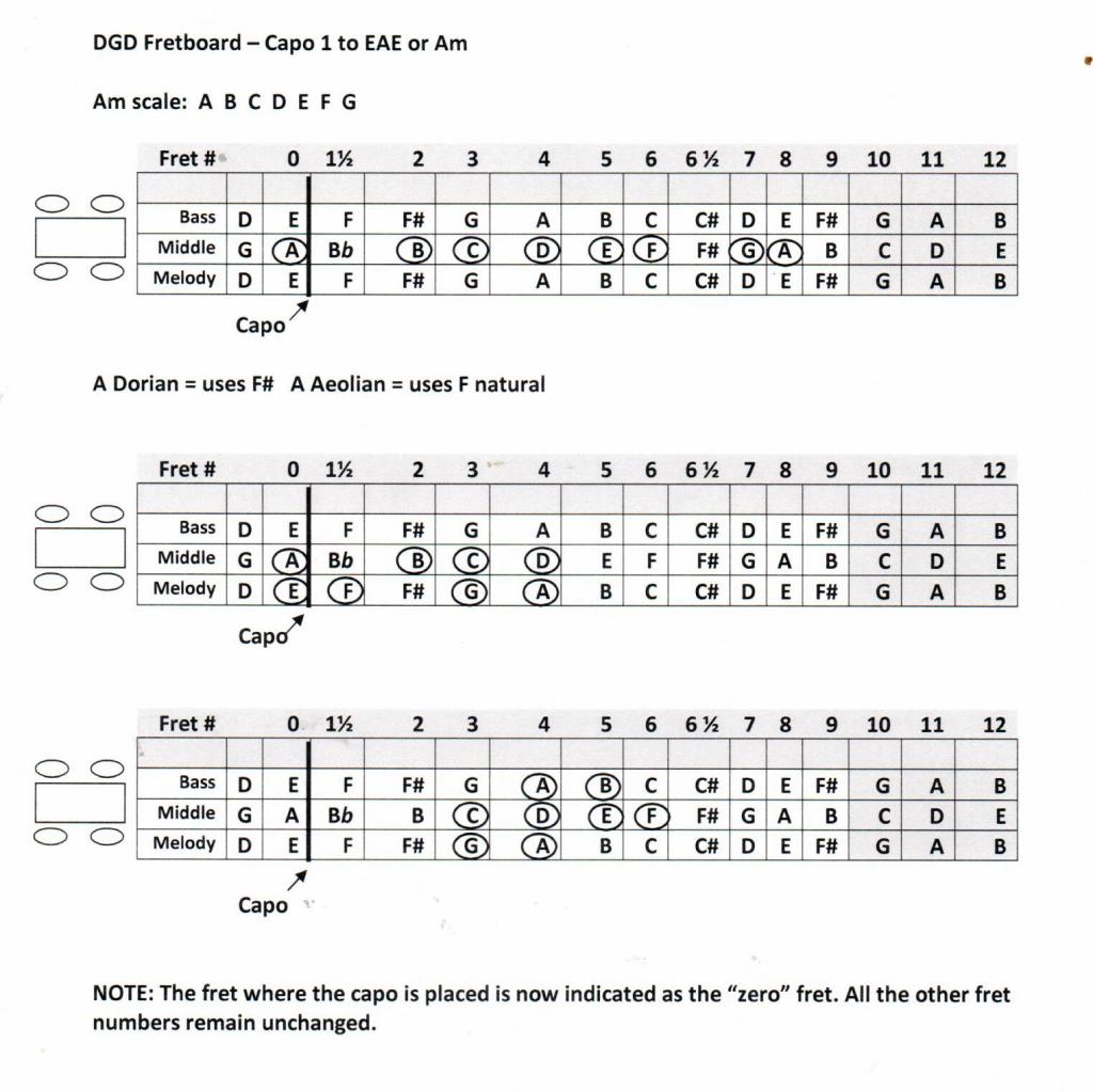 I “auditioned” my dulcimer collection to find a dulcimer with balanced tones. Since the A Dorian scale (DGD, capo 1 tuning) is on the middle string, it is helpful to have a bass string which is not too loud. A strong bass string can overpower and drown out the melody on the middle string. This dulcimer has a phosphorus bronze string on the bass but it does not appear to be wound. Also, placing a capo on at the first fret shortens the fretboard. Dulcimers with a short vibrating length can lose their resonance when a capo of placed anywhere on the fretboard. And sometimes some of the strings “buzz” when a capo is used. These are other considerations, especially when purchasing a dulcimer.