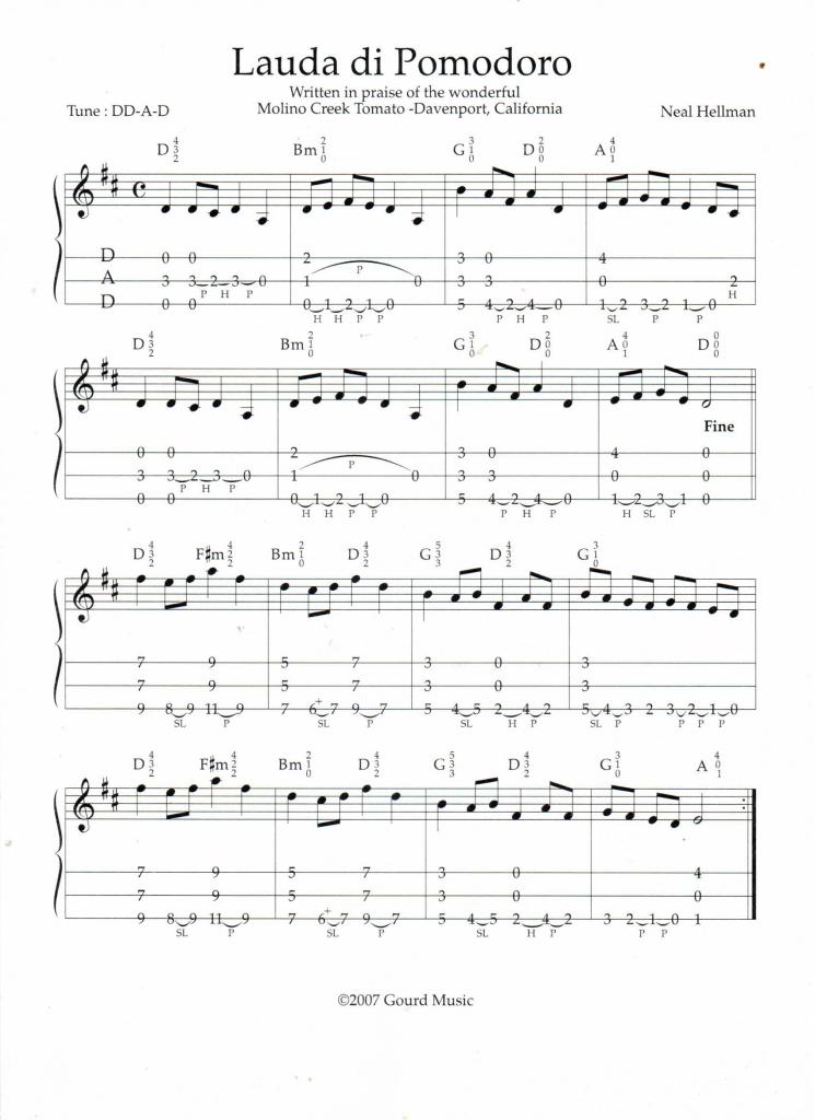 Today I am playing a tune which is a tribute to summertime tomatoes, “Lauda di Pomodoro.” I was intrigued that anyone would write a song about tomatoes. But if you live in a “tomato desert” with only bland and under-ripe tomatoes sold in grocery stores, then you can appreciate the excitement at discovering a wonder ripe, juicy tomato. This tune is delightful to play on the mountain dulcimer because is was written for the dulcimer. It is full of hammer-on’s, pull-off’s and slides which make for smooth playing and give a feeling of exclamation points. Adding these ornaments to dulcimer arrangements is associated with a certain style of playing the dulcimer. The master of this technique is Neal Hellman who wrote this tune. And, of course, there is a story to go along with the tune.