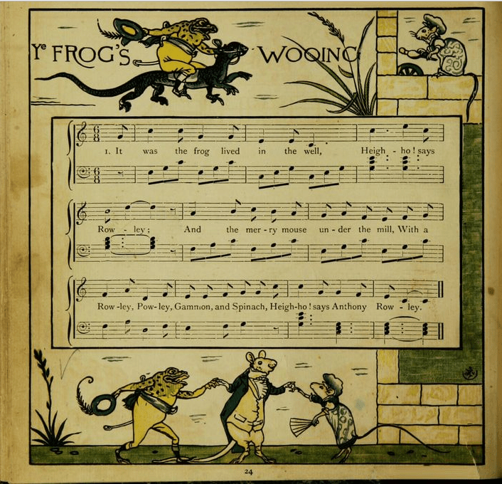 Here’s an illustration of the song from an early book featuring this tune, “The Frog’s Wooing”, in “The Baby’s Opera: A book of old Rhymes and The Music” by the Earliest Masters. I always thought that this children’s song was an English one but it may have Scottish origins. The first known text was published in 1549 in Scotland. The first musical version was published in England in 1611. It has multiple verses about a frog who asks Miss Mouse to marry him. But not without Uncle Rat’s consent, she says. Undoubtedly there is hidden meaning to the verses, possibly a parody of English courts at that time.