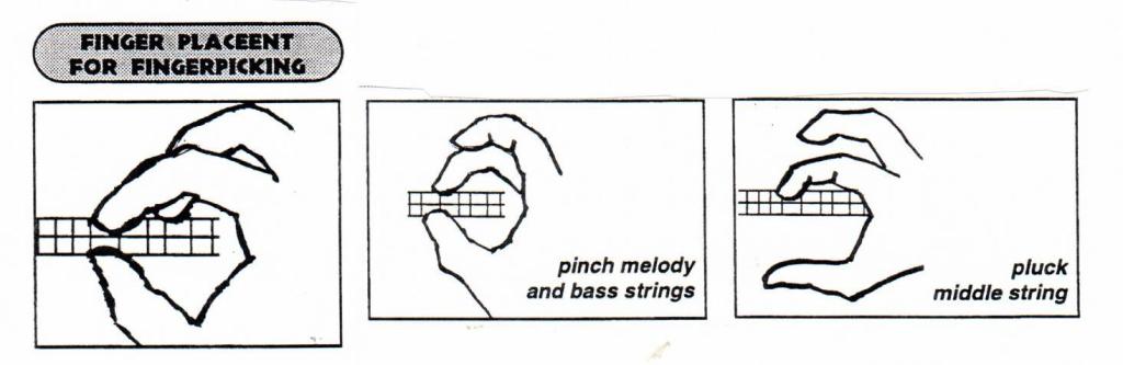 - “Pinch-Pluck & Pluck-Pluck” (Pattern II): On the first two beats of the measure, follow the pattern above. “Pinch” the melody and bass strings with your thumb and middle finger, respectively, on the first beat. On the second beat, “pluck” the middle string with your index finger. On the third beat, “pluck” only the melody string with your thumb. On the fourth beat, “pluck” the middle string with your index finger. Repeat this pattern for the rest of the song.