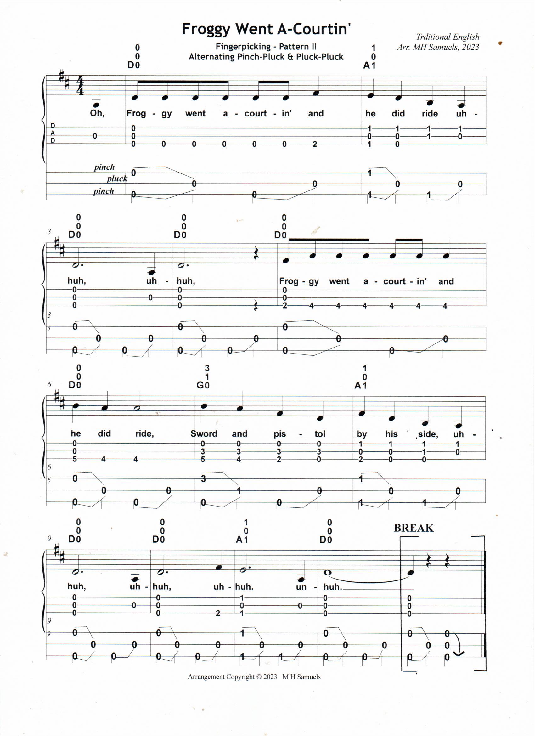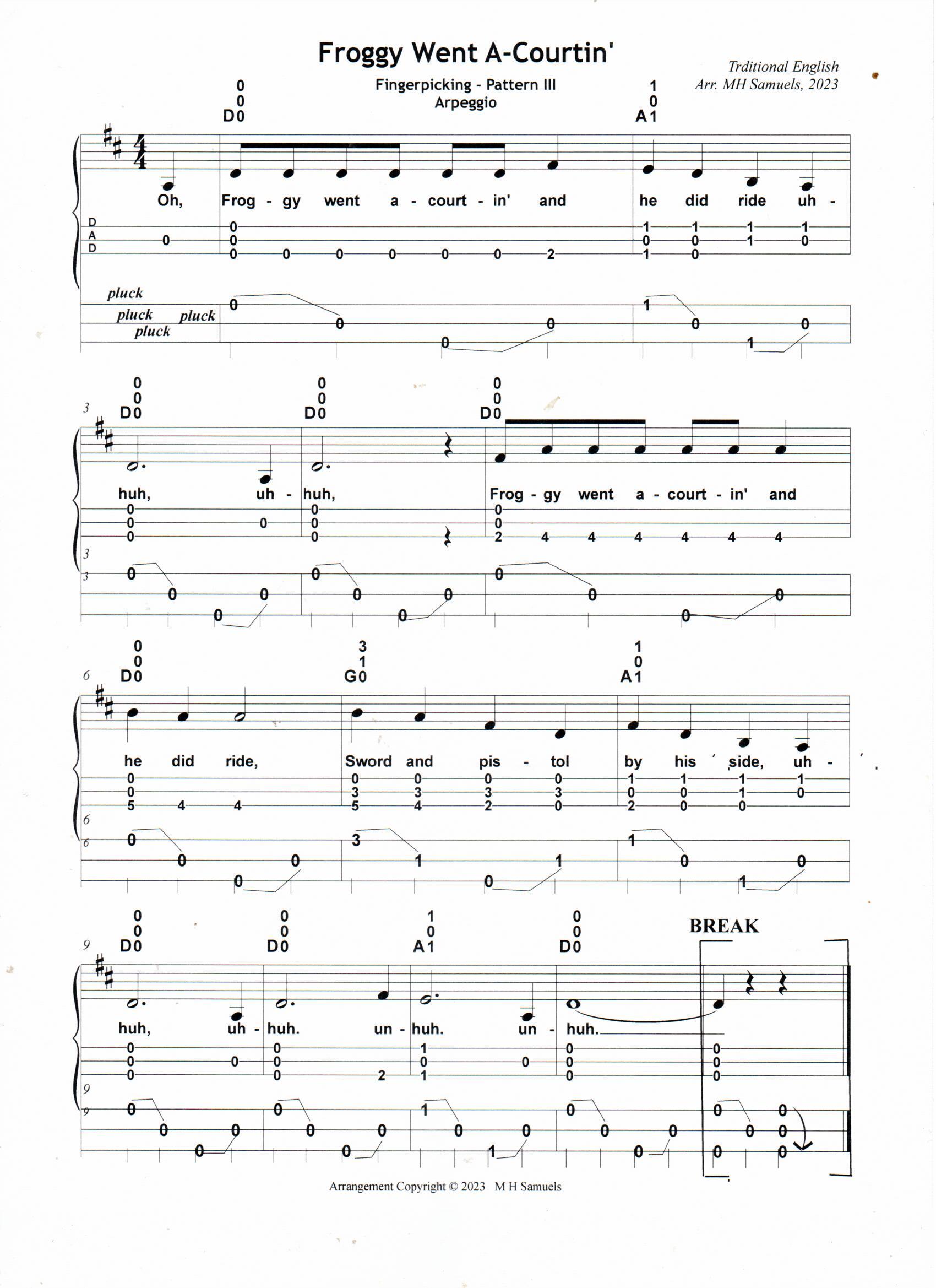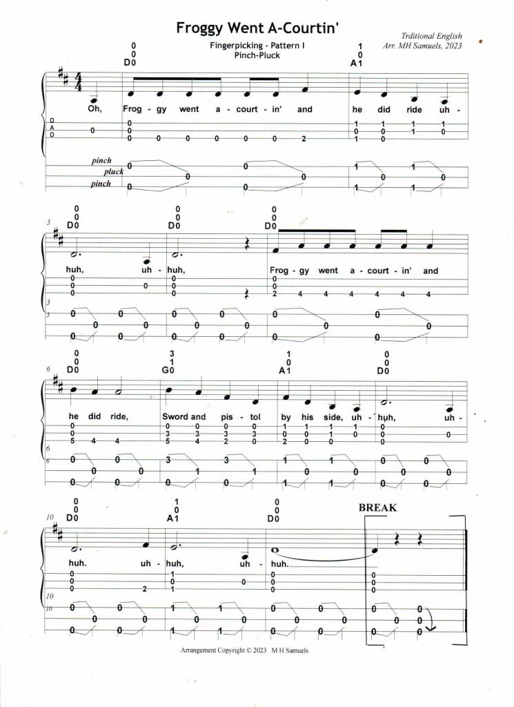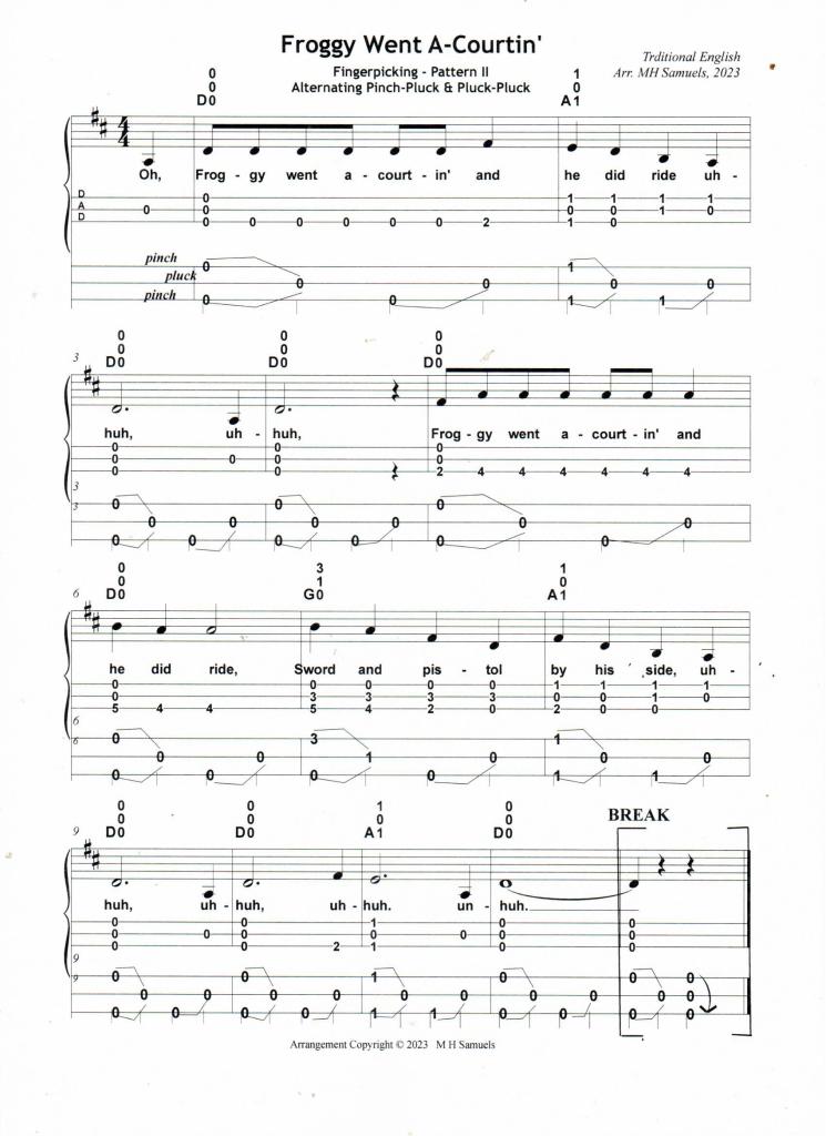 Here is my version of “Froggy Went A Courtin'” for dulcimer with the melody tabbed out as well as fingerpicking patterns and lyrics. These JPEGS are not intended for download — there’s an extra measure in these versions. I are included PDF files (which are correc) to download. Enjoy!