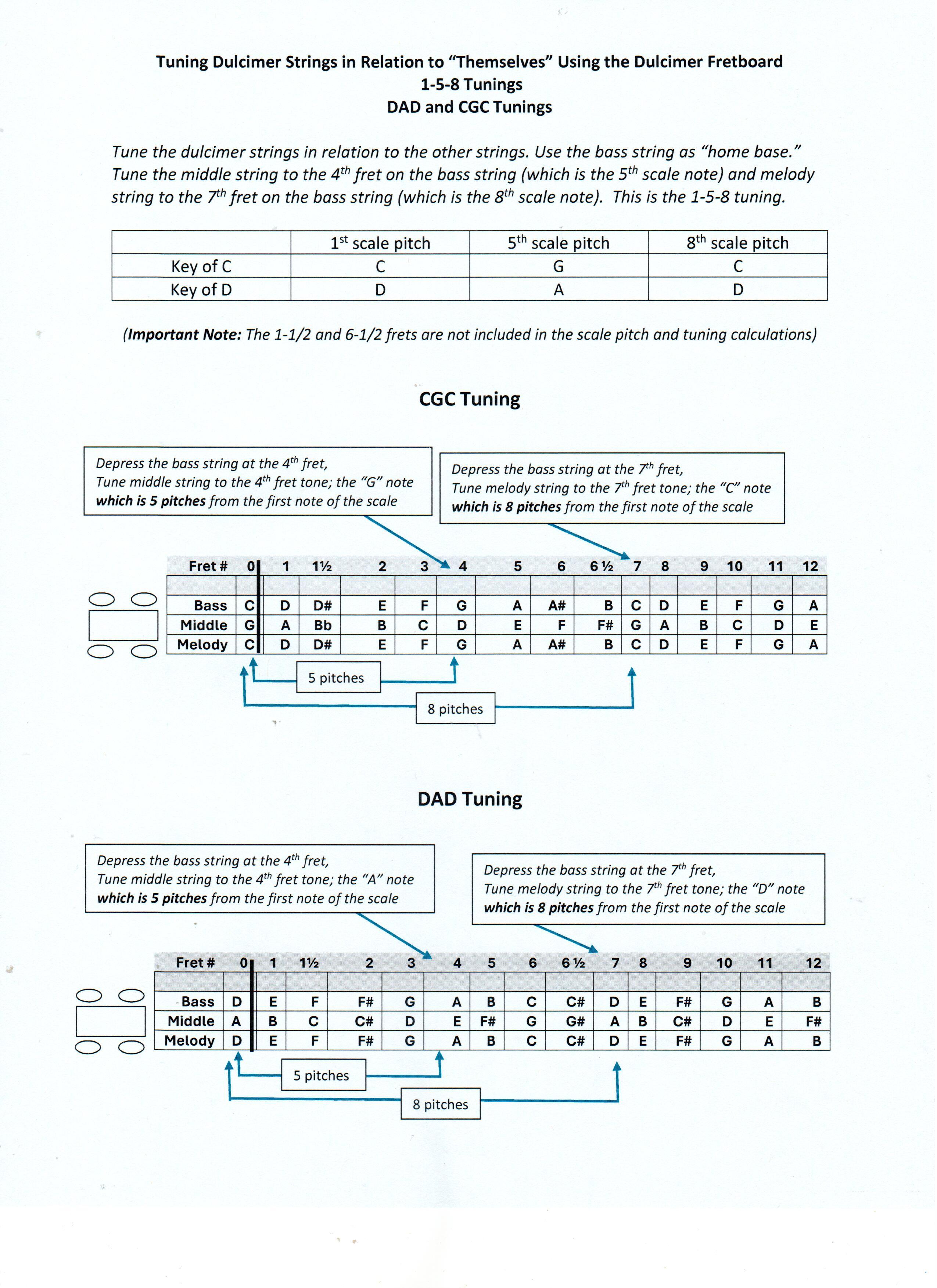 8. A person can certainly tune the dulcimer many other ways to many other string pitches. For example, DAA tuning is a 1-5-5 tuning. DGD tuning is often termed a 1-4-8 tuning. DAC tuning can be considered to be a 1-5-7 tuning. Since these tunings have different relationships between the strings, you can’t play the same tablature numbers as DAD, CGC or any of the other the 1-5-8 tunings. These are all different “families” of tunings. They are not “identical twins” to DAD and 1-5-8 tunings.