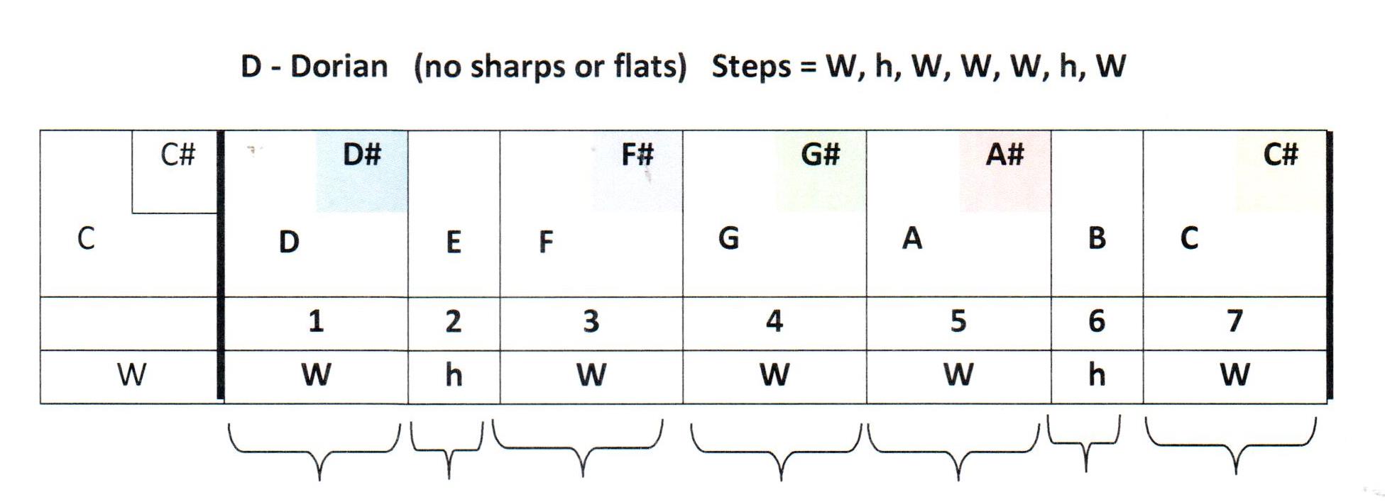 (Trust me on the patterns, I looked at this until my eyes became dizzy.) Remember that D Dorian does not have sharp or flat notes. However, other “Dorian scales” starting with other notes must incorporate some sharp notes to keep the Dorian step pattern correct.