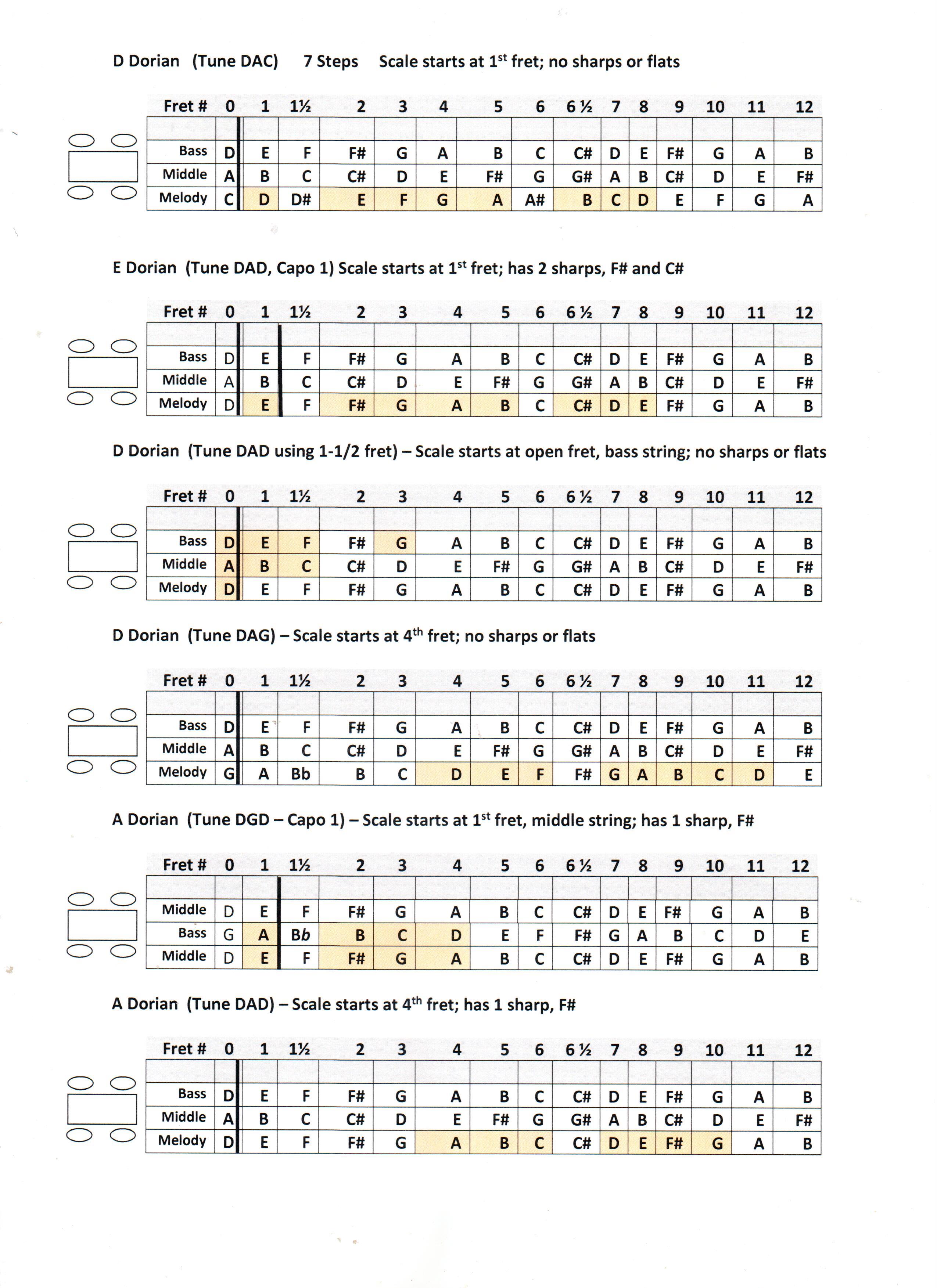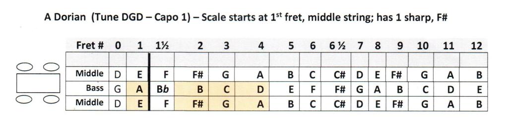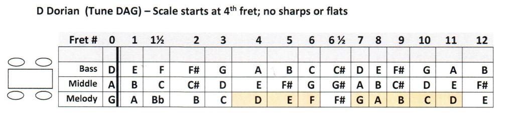 3. I figured out that another way to play the D Dorian mode is by using the 1-1/2 fret and tuning the dulcimer to DAD. In this case, the scale starts on the bass string, “0” fret and goes across the strings. Still no sharps or flats!!
