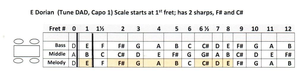 2. A second way is to tune to DAD and place a capo on at the 1st fret. This is E Dorian. (This scale does have two sharp notes since you are no longer starting with a D note. You have to compensate to keep the whole and half steps in sync.) Again, the scale begins at the 1st fret and goes up to the 8th fret (using the 6-1/2 fret).