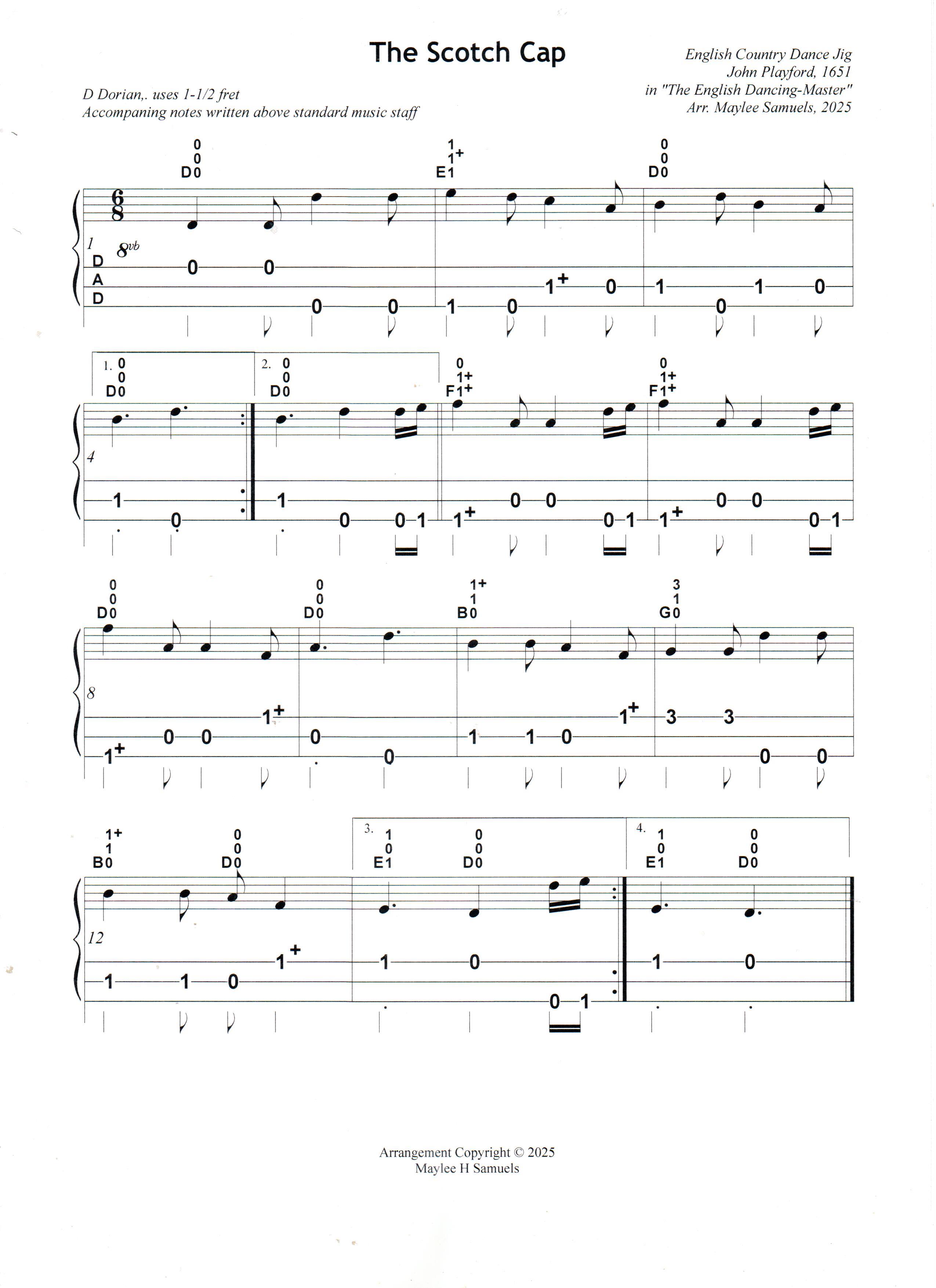 Here is a lovely English jig, “The Scotch Cap,” which was originally published in the “English Dancing-Master” by John Playford in 1651. It is a great tune to play on the dulcimer. I uncovered dulcimer tablature for this tune while sorting through an stack of music which I’d set aside to “learn sometime.” The tab is from Mike Casey’s workshop at one of the Appalachian State Dulcimer Workshops which I attended years ago. The jig is mesmerizing, haunting and very addictive. However, the melody doesn’t quite sound like it is written in either a major or minor scale. So, I wrote down all the notes and did a “Google” search. I found that the tune is written in the Dorian mode. That led me into a “deep dive” to learn about the Dorian mode. I wrote out my own dulcimer tablature for “The Scotch Cap” using the 1-1/2 fret (I’m cheating here) and find that the song very easy to play on the dulcimer. That’s good, as jigs are often played at a spritely tempo. I also give an explanation of the basis for a “mode” and our mountain dulcimer “diatonic” scale. However, if you are not interested in music theory, just skip to the song at the end of the post!