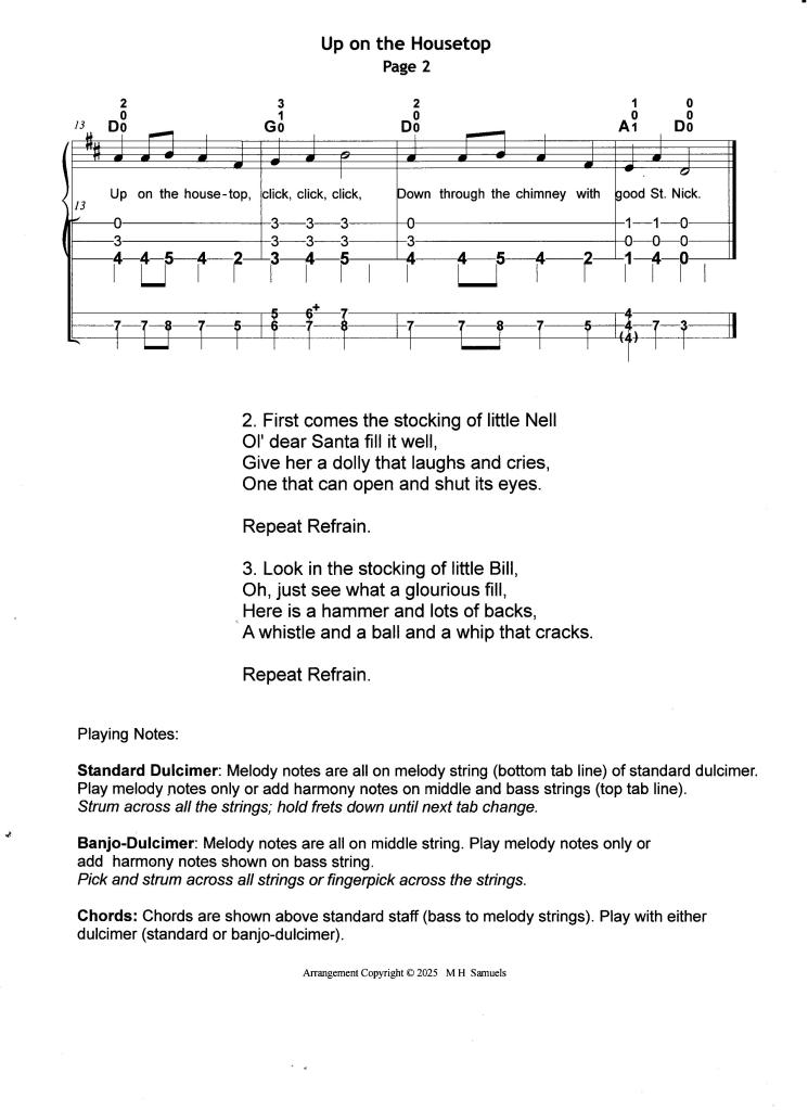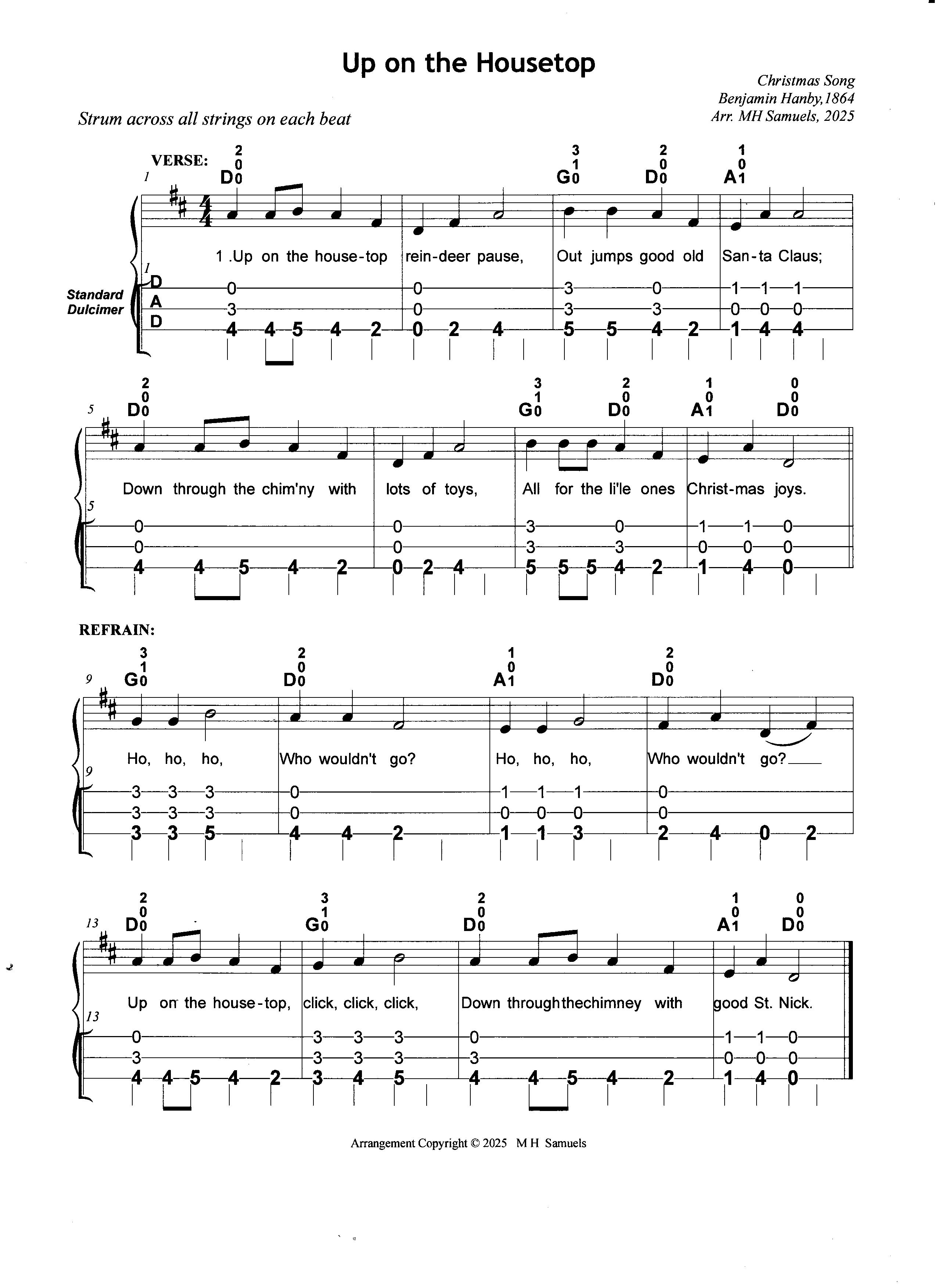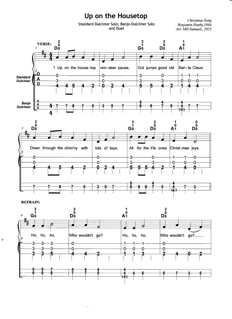 “Up on the Housetop” is one of my most favorite, venerable Christmas tunes. It is bright, rhythmic and is a tune which everybody knows and can hum along to. Add in bells and a limberjack (for reindeer) and we’ve got the Christmas spirit. Ever since I was a kid, I couldn’t wait until Chrismas came. It seemed to take so long to get here. Then, the Sears & Roebuck mail-order Christmas catalog came in the mail and I knew that we were getting closer. Christmas music — both religious and secular — is a large part of the atmosphere leading up to Christmas celebrations. “Up on the Housetop” is surprisingly easy to play on the mountain dulcimer. I tabbed out a version for standard dulcimer. In the Christmas spirit, I also tabbed out a version on the middle string for a banjo-dulcimer to play.